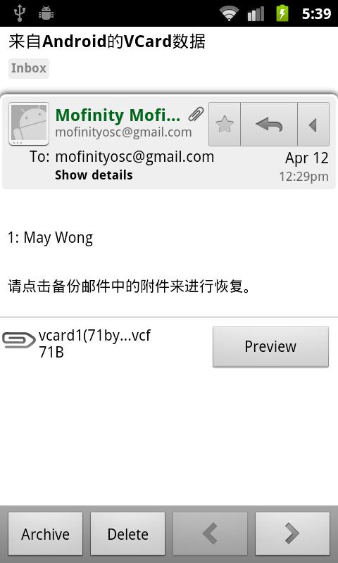 - 簡單一按備份電郵附件即能載入或合併單個或全部電話聯絡人。