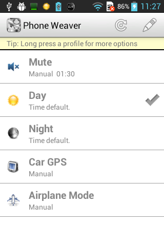 PhoneWeaver is the ultimate profile manager! Define smart profiles that are activated manually or automatically based on time, schedule and meetings, power connection and even location!
