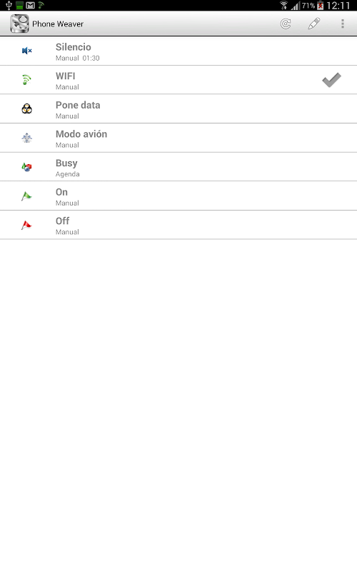 PhoneWeaver is a complete and advanced profiler that can fully automatize your phone tasks and help you ensuring you won't ever miss a cal because you have forgotten to remove the mute mode, launching your GPS navigation program as soon as you dock the device in your car, saving battey by adapting mobile data, WIFI, Bluetooth, brightness, etc. to your specific need for each situation without you even need to select anything!