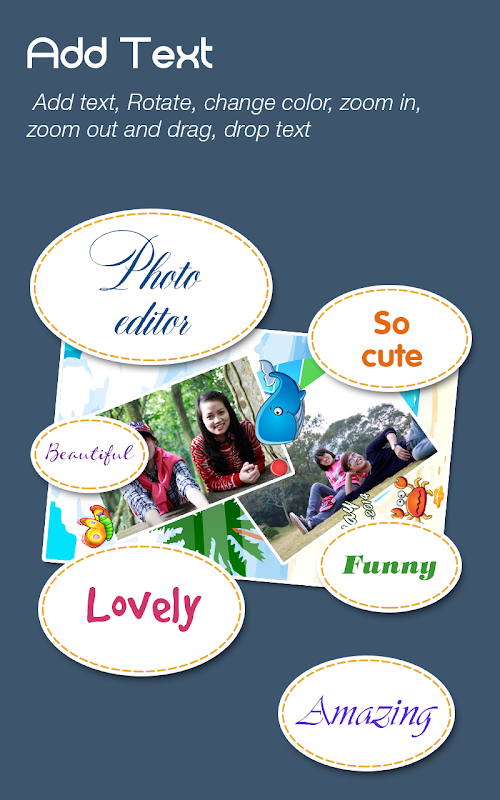 ● Add text, Rotate, change color, zoom in, zoom out and drag, drop text use your fingers.