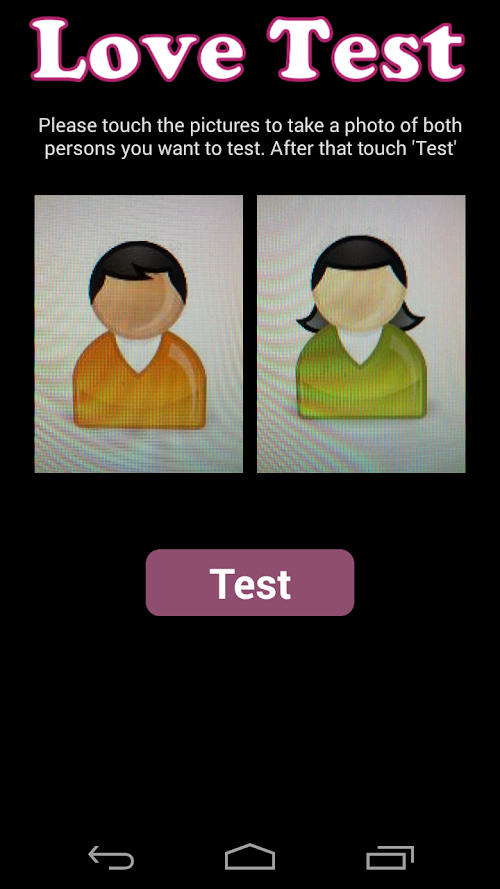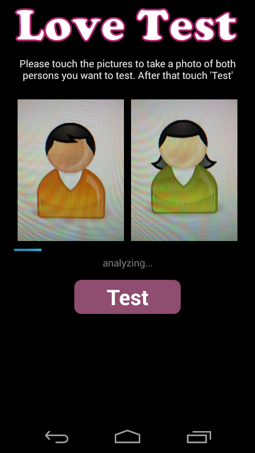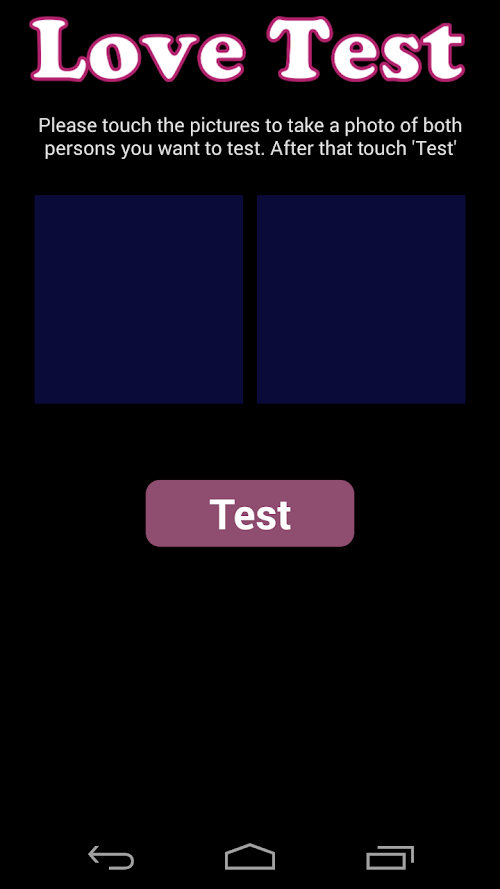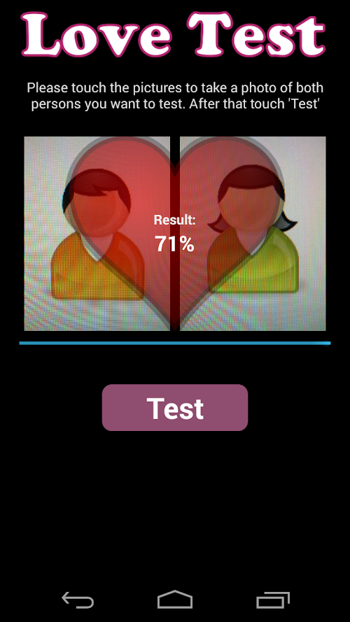 This app checks whether two people fit together and could love each other. Simply take a photo of two people and start the test. After a short analysis of the photos you will receive the result of this love test.