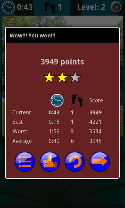 After finishing a level, the score you got and a complete statistic with information about your best time, the number of movements, as well as your worst time and average value of all games played on this level will be showed.
