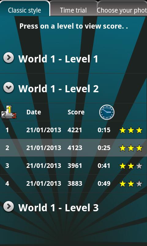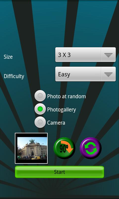 - Choose your photo style: a free style, where you choose the difficulty, the board size and the photo (making a photo with your camera or choosing one from your gallery). Play with your own photos!!!