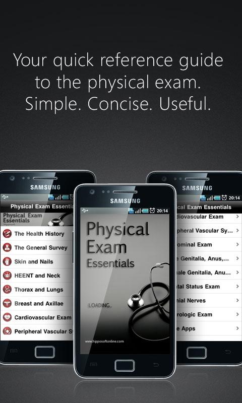 Physical Exam Essentials is not a comprehensive medical reference. Rather, it is a handy overview resource that is perfect for medical students, pre-meds, health professionals and anyone who practices or has an interest in medicine. Conveniently located on your mobile device, this application provides quick, easy-to-use reviews of procedures and techniques for 14 different categories: