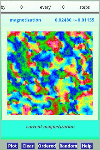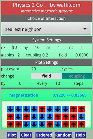 The app calculates an interacting system of spins (or magnets), including the well-known Ising model as well as more complex systems. You can choose the system size in up to 4 dimensions. The updating of the spins is done by a standard Monte-Carlo heatbath algorithm.
