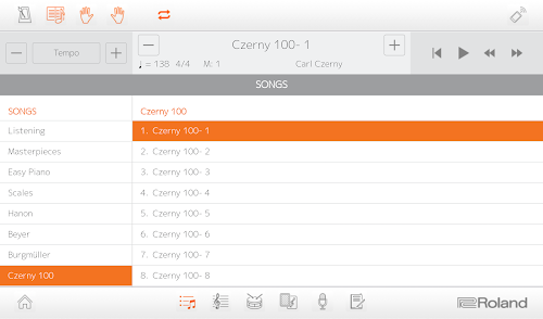 Songs—browse and select music from your Roland digital piano’s onboard song library