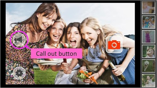 When you tap the Call Out button, you will hear sound such as “Say Cheese!” Push the button to make a child look back or to make a crowd smile. The sound can be selected from variety of options, from mechanical sounds to animal sounds. The app comes with 31 preset sounds, and the sound file in your handset can also be used as the call out sound.