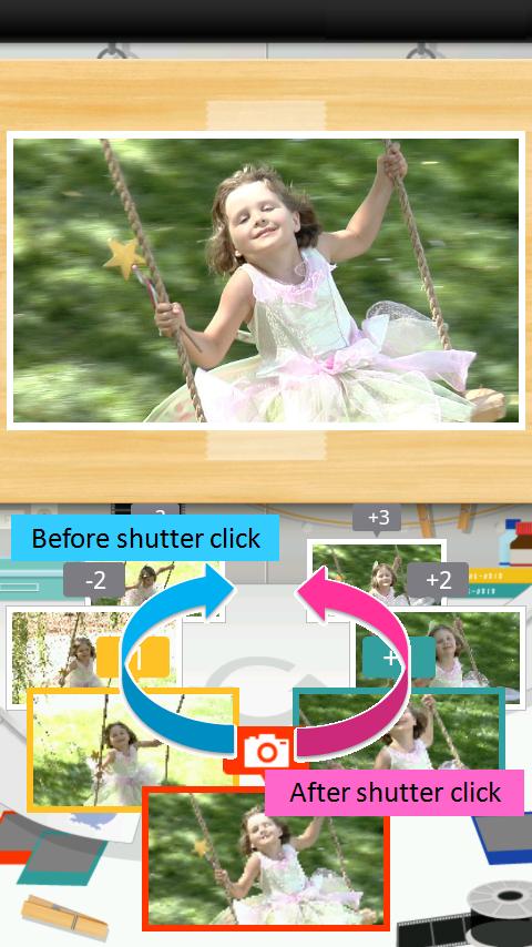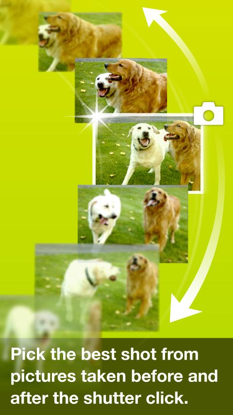 pick pic camera is a camera app that allow you to record photos right before and right after the moment you pressed the shutter button along with that very moment. You will then be able to pick the best shot among the pictures taken and save it as a still picture.