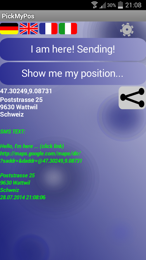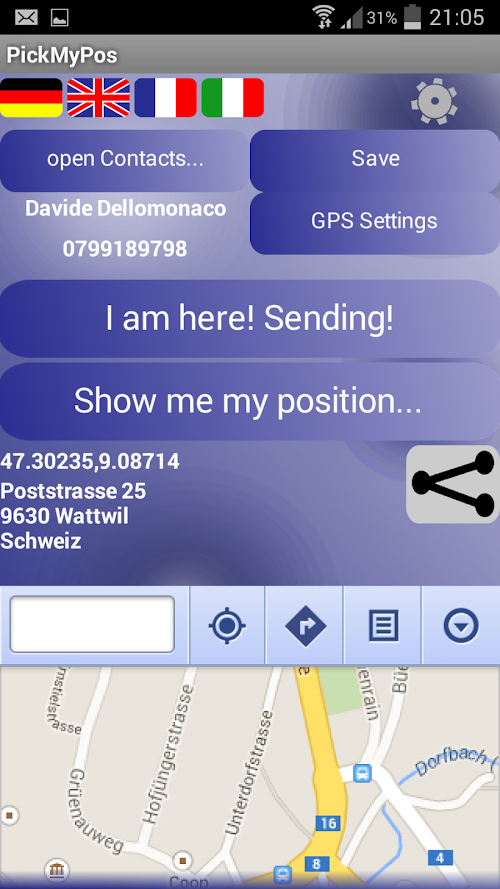 With this app, you can use the GPS position parts. In two ways: The Option provides a Fix stored phone number (your Choose) which then sends the position data with a direct link and then the receiver can directly start navigating. This can be helpful for children who get lost or need to share your location.