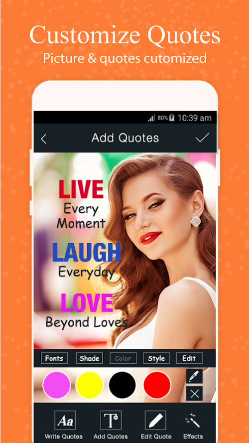 Picture Quotes - Quote Maker is complete text editor which has lot of edit options such as text size, cool fonts, font color and more. The app has all the popular and most used fonts, colors and styling options for that.