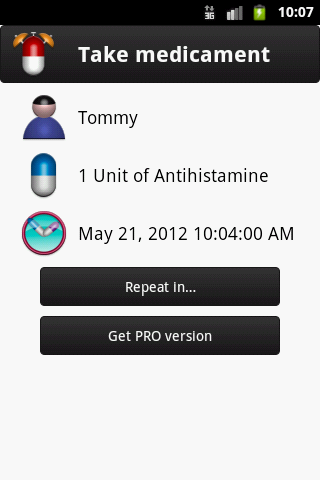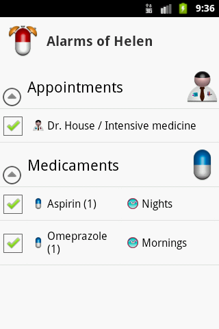 Create a patient for each member of your family. For each patient, you can add the necessary medicines and schedules most commonly used, ("Three times a day," "Meals", "Breakfast and dinner"...). Then, you can set alarms to remind you that someone has to take his/her medication.