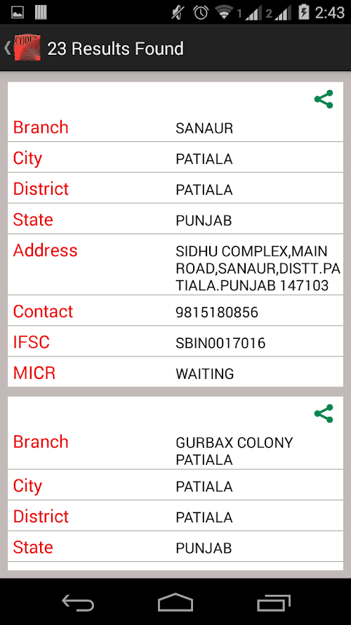 * Search results are sorted alphabetically in order of Branch Names in case of IFSC whereas , Office Name in case of Pincode.