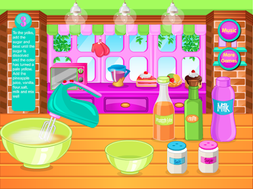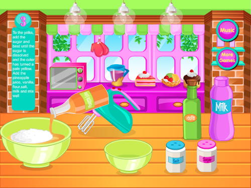 In this game you have to concoct some pineapple cupcakes and we need your help. You must help us do this because you will like and you will be satisfied with the work done. To prepare these cupcakes we need eggs, sugar, pineapple juice, vanilla, flour, salt and milk. First you have to break the 3 eggs and beat them well with a mixer. Next we need to add sugar over the beaten eggs then add flour, pineapple juice, vanilla and milk. All these should be mixed thoroughly for a few minutes to mix with other content. Content obtained should be put in a few cups cake in order to get a good shape after that we will bridge a few minutes in the oven to bake. Thank you for helping us to make these cookies and invite you to choose and other games for girls and cooking games created by us to test your skills in games like this.