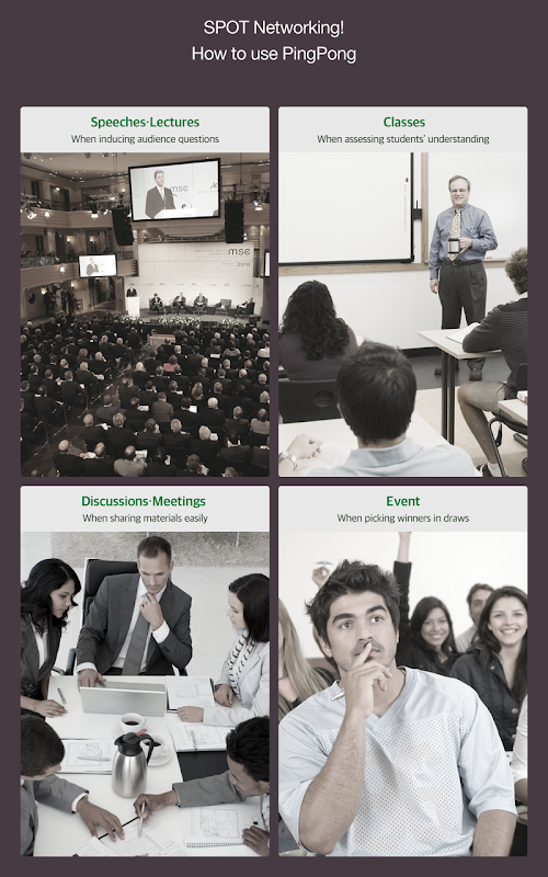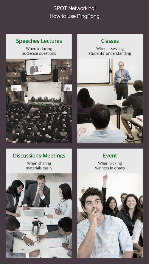 PingPong is a tool that enables communication for people who have gathered for a lecture, class, discussion, etc. It can be useful for inducing audience questions, assessing students' understanding, sharing materials easily and selecting winners in draws without a complicated registration process.