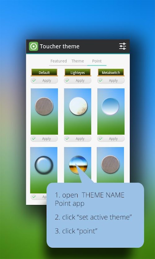 #HOW TO APPLY: After download, simply click OPEN and you will enter the theme's menu. After that click on "Set Active Theme". Then click on the Point tab and selected this theme!