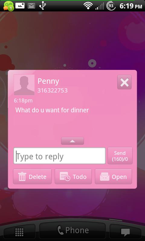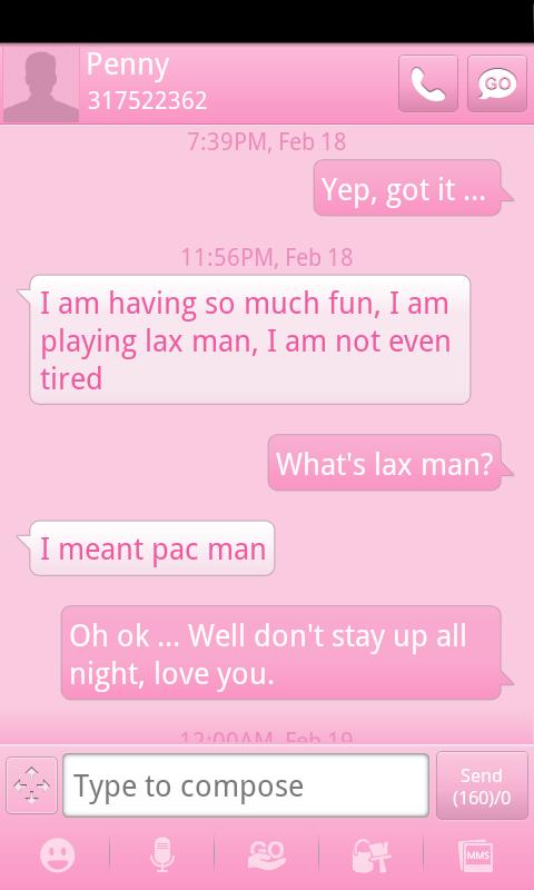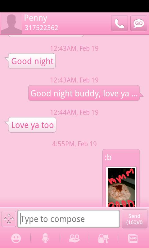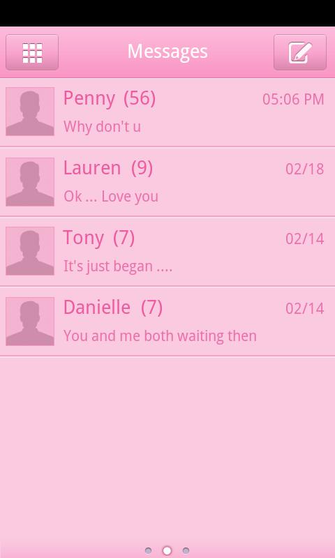 A nice pink theme for GO SMS Pro (Free). This Pink Theme was created to help bring awareness to breast cancer month.