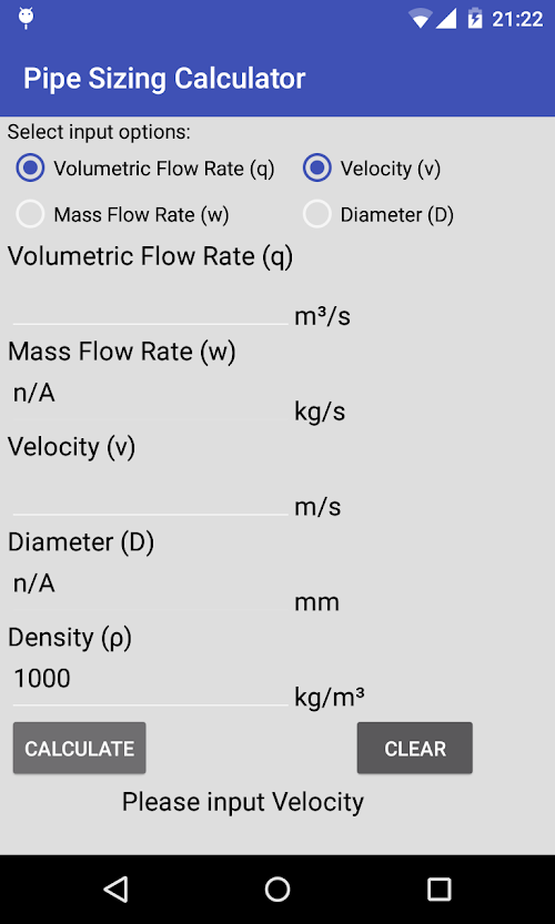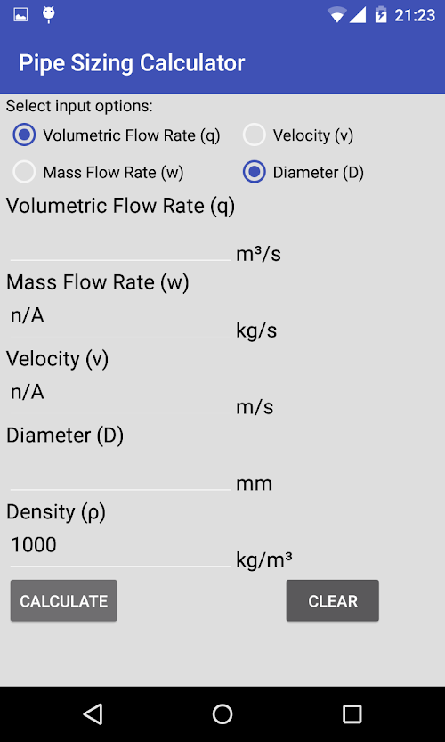 Pipe Sizing Calculator provides a quick and easy way to calculate the required internal diameter of piping (Gas / Liquid - Using value of density).