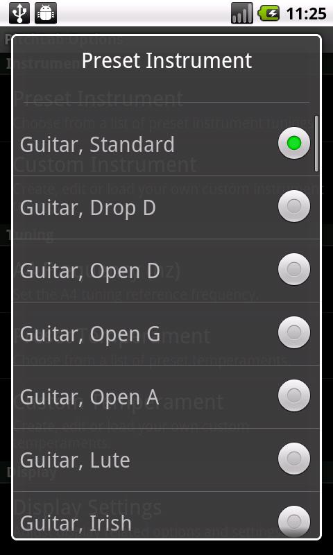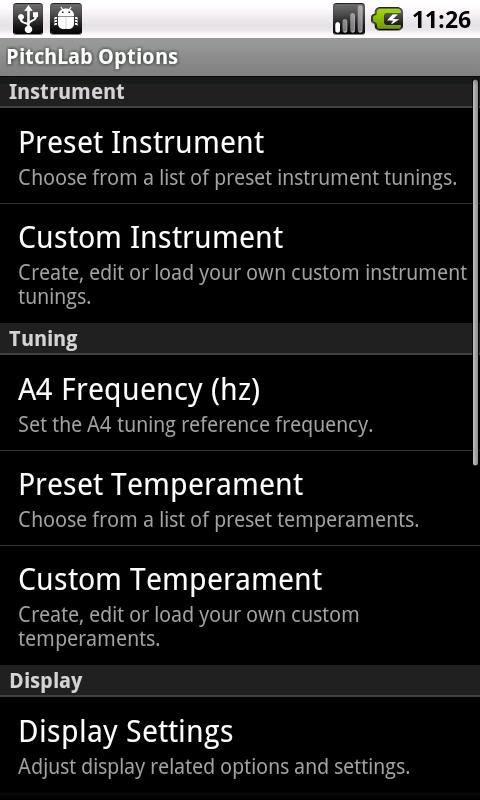 These visualization modes are easily accessed by swiping the screen left/right or by pressing & holding the tuner display to get a pop-up view selection menu. User-selectable options are accessed via the MENU button or the pop-up view selection menu and include support for custom temperaments.