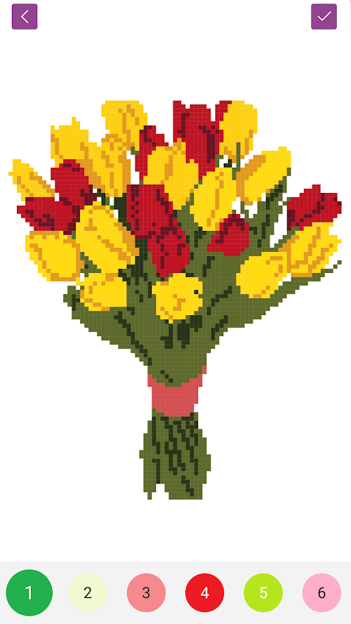 Choose a color from the palette and touch to a desired cell. You can recolor wrong color blocks. You can hold and swipe on a pixel to make a faster coloring. Zoom on the image to color the details.