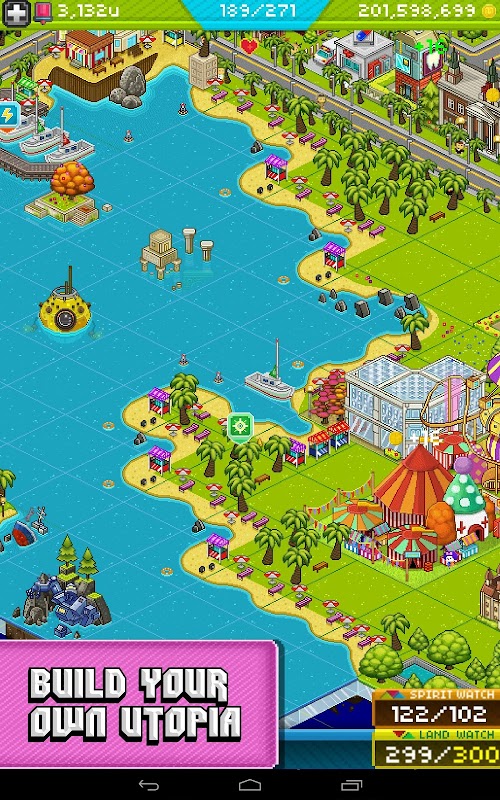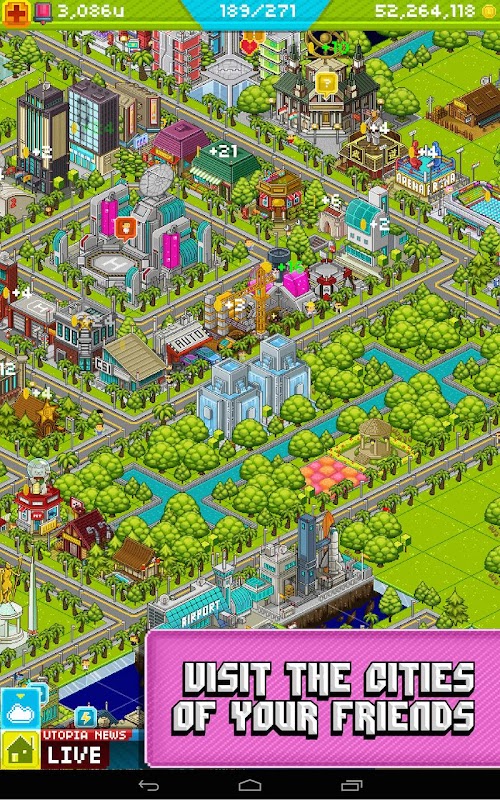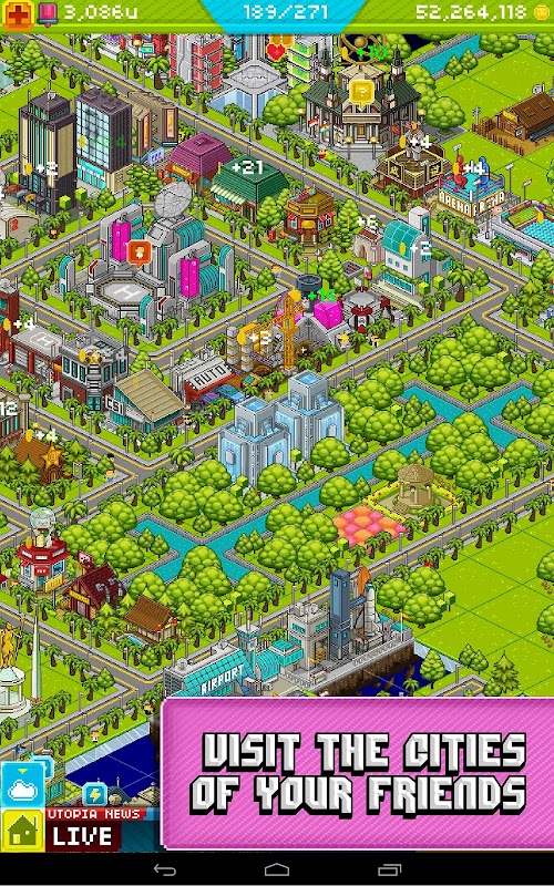 Each new job you create for a Utopian resident puts money in the bank, and the more residents you place in each building, the more money you make! Use your cash to build more residences, places of work, and to expand your land with over 100 buildings including the Google “Tech Park” exclusive to Android mayors.