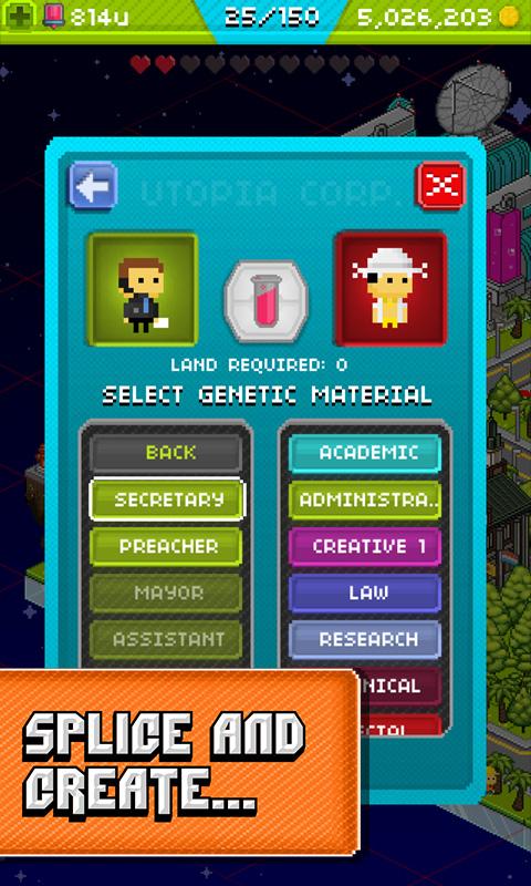 Greet new clones to Utopia at the arrival centre, then find them a place in your new world. Splice genes of residents and combine their skills to discover new Pixel People to join your thriving city.