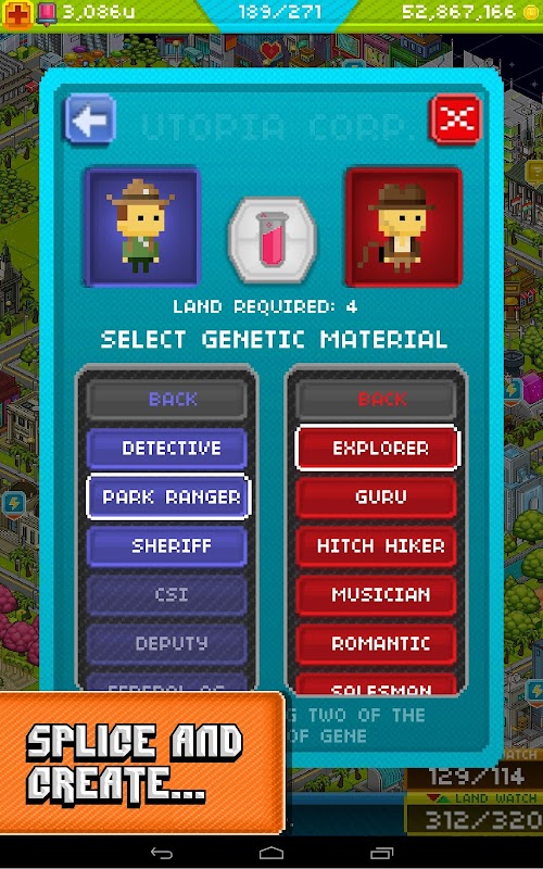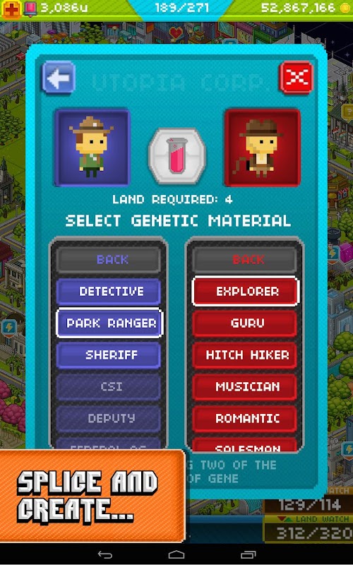 Combine the properties of Utopia residents to create 280 new occupants, each one suited to a special role in your new society.
