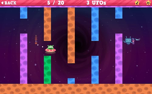Guide your UFO safely across 100 levels over five different worlds each with different surfaces and gravity effects. Navigate around the obstacles to complete the worlds in as few attempts as possible!