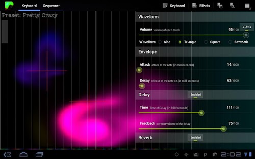Beautiful music instrument inspired by the Theremin, Continuum, Keyboard and Sequencer. Touch the screen and a note is generated. It's X-Axis (left-to-right) is pitch, which is designated by note and octave markings. It's Y-Axis (up-and-down) is up to you to control! Plasma Sound is incredibly configurable. Pick the note range, the waveform, cutoff, delay, tremolo, vibrato and more! You can even select between continuous mode (theremin-like), quantize mode (keyboard-like), and a hybrid.
