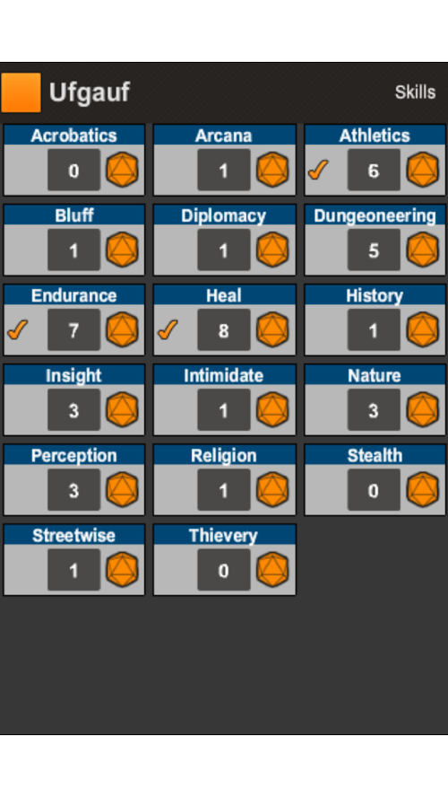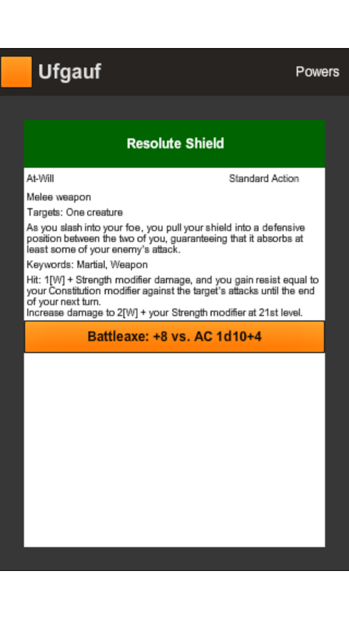 "But beyond mere information from the character sheet, the app also allows the player to tap certain features, like ability scores, skills, and powers, and roll a d20 for a check or an attack, and even the damage dice on powers!" -www.enworld.org