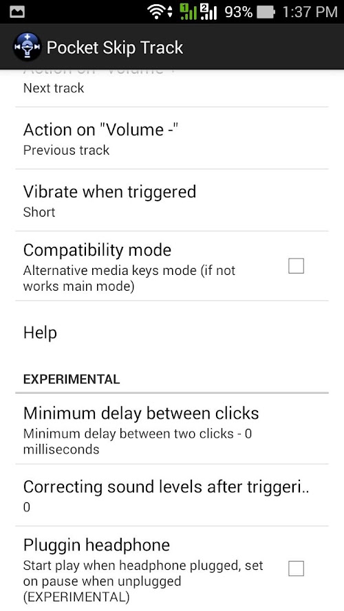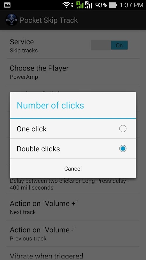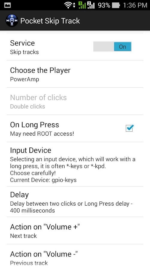 To switch to the next track you need to make two clicks on the "volume up" with a delay of no more than specified in the "Delay". Accordingly, previous track - "volume down".