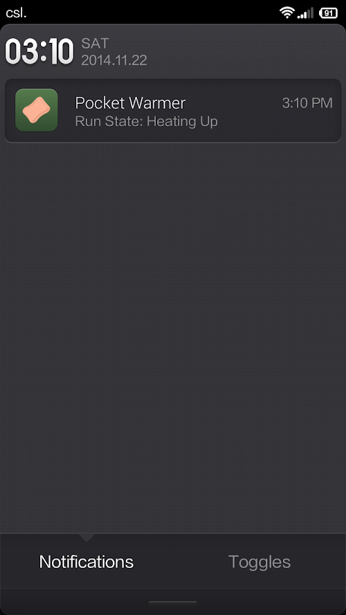 Warning: this application may do harm to your phone, user have to estimate and take the risk of using Pocket Warmer.