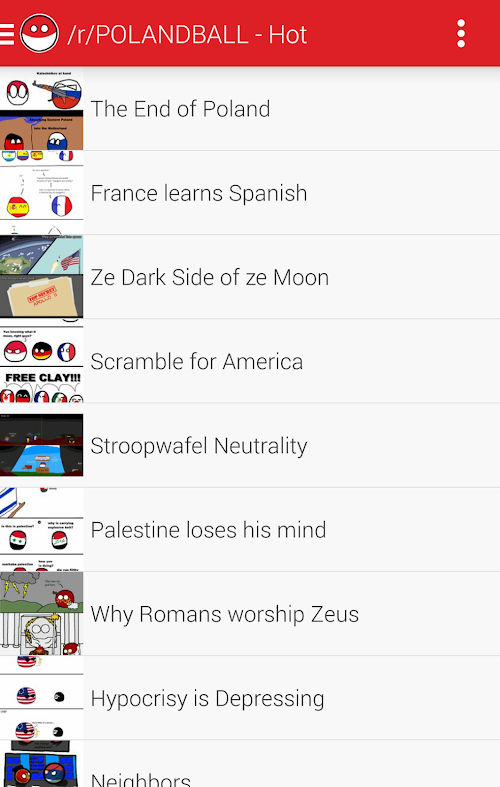 Polandball & Countryball Viewer allows you to browse through the most popular Countryball and Polandball related subreddits on your mobile device. The user interface is designed to provide the best possible user experience while reading countryball comics on the go.