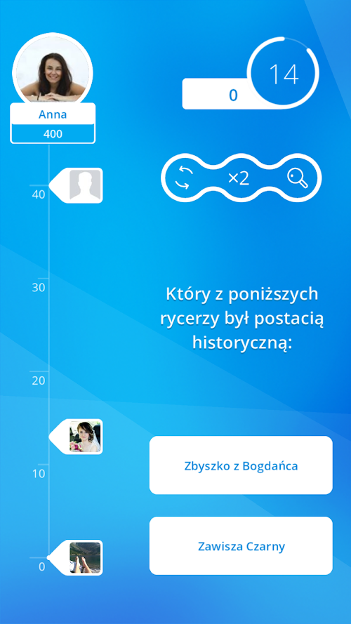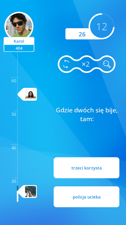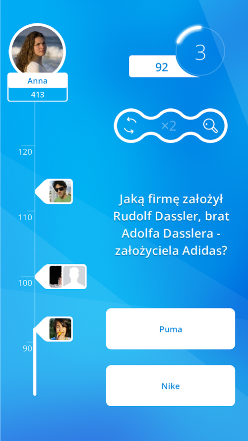 Podobnie jak w teleturnieju Milionerzy masz do dyspozycji 3 koła ratunkowe. U nas są to: zamiana pytania, wyszukanie pytania w Google i podwojenie swojego dorobku punkowego.