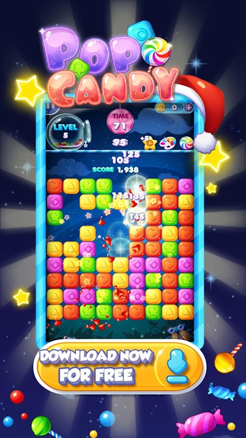 Whip your way through dozens of sweet candies by tapping on two or more adjacent candy blocks, choose your favorite mode and POP now, you'll find out how relaxing the game is!