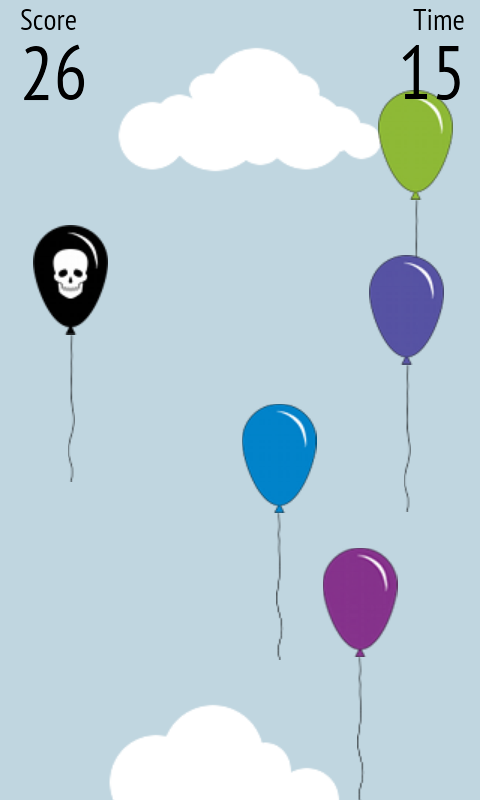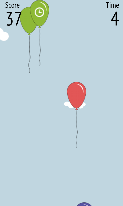 Faster balloons award you with more points. To make things a bit more difficult, every balloon that travels outside the top of the screen without being popped reduces your time. You can get more time by popping balloons with a clock symbol. You should avoid popping purple balloons, as they reduce your points. Popping a balloon with a skull symbol ends the game.