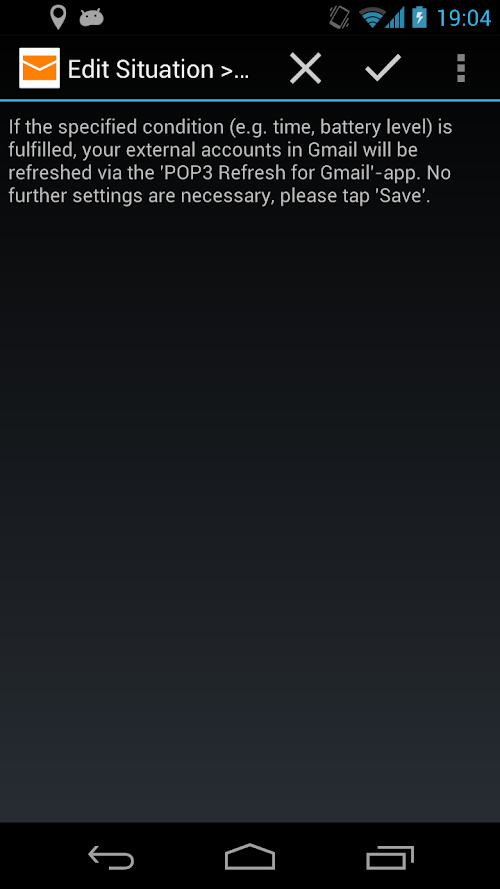 This plug-in integrates the app "POP3 Refresh for Gmail" (http://goo.gl/hdlLe) with Locale and Tasker. Want to automatically perform a refresh of your external accounts in Gmail when you arrive at the office? Or perform refreshes at multiple times during a day? Now you can!