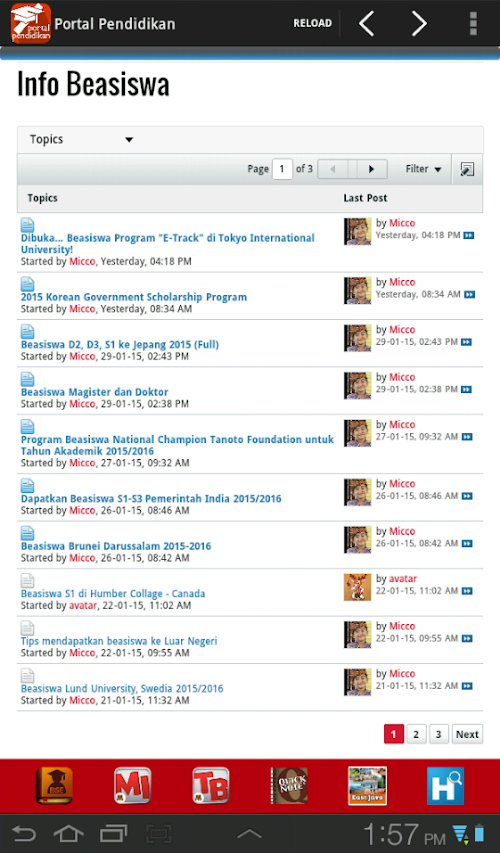 Aplikasi Portal Pendidikan bisa diakses dengan mudah melalui Android smartphone dan tablet, dan dengan mudah pula siapa saja bisa bergabung dengan forum di dalamnya untuk mendapatkan info terkini seputar dunia pendidikan, baik kabar seputar kurikulum baru, diskusi pendidikan, beasiswa bahkan untuk informasi lowongan pekerjaan.