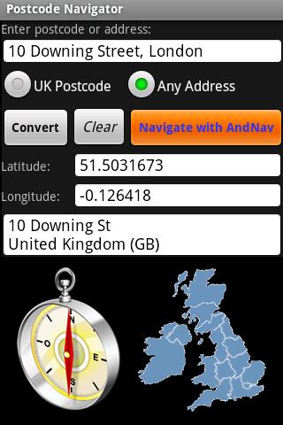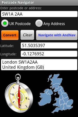 Postcode Navigator lets you navigate to any UK postcode using the AndNav satellite navigation app. AndNav users will know that its postcode lookup is not very accurate as postcode location data is so expensive. Now you can easily convert a postcode into a latitude / longitude & navigate straight there like any other SatNav!