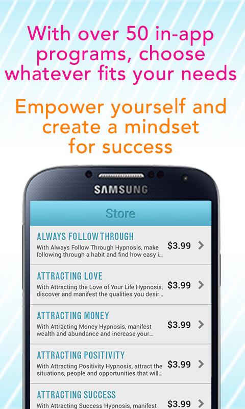 * Your choice of one of eight different soothing background animations and sounds to enhance your hypnosis experience