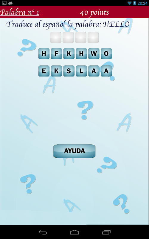 The game consists of a word in English, and a series of letters between which are necessary to form the Spanish translation, camouflaged among others.