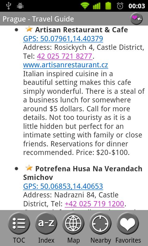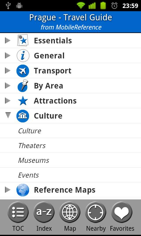 MobileReference Travel Guides provide detailed, practical information about attractions, landmarks, transportation, cultural venues, dining, lodging, history and much more. They are indexed alphabetically and by category, making it easier to access individual articles. Attractions can be viewed on an offline GPS map along with your current location so that you can easily find attractions near you as you explore the city.
