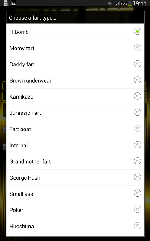 ★ Create your personal fart: using super processing audio effect it is possible to create your personal fart. It is possible to choose between girl and man farts and also changing the fart's length.