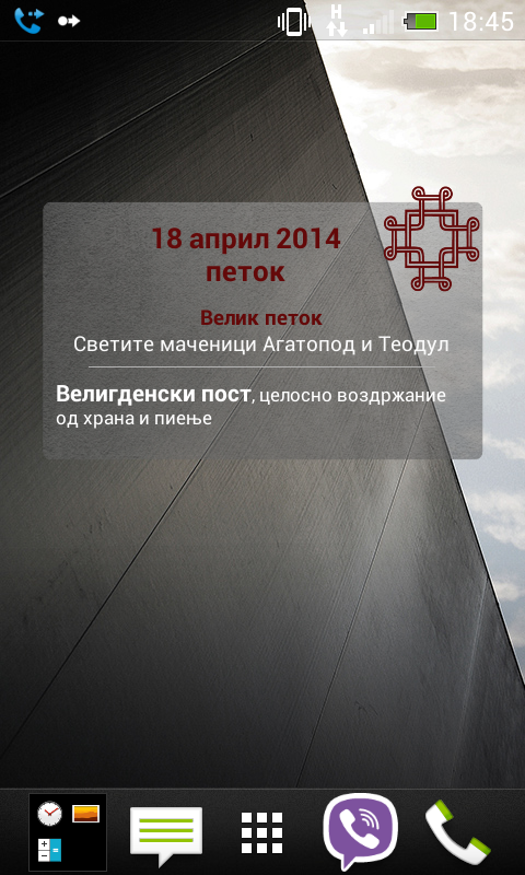 This widget is an addition to the application "Pravoslaven Kalendar". It contains the Saint and/or feast commemorated on the current day. Also includes the way of fasting.