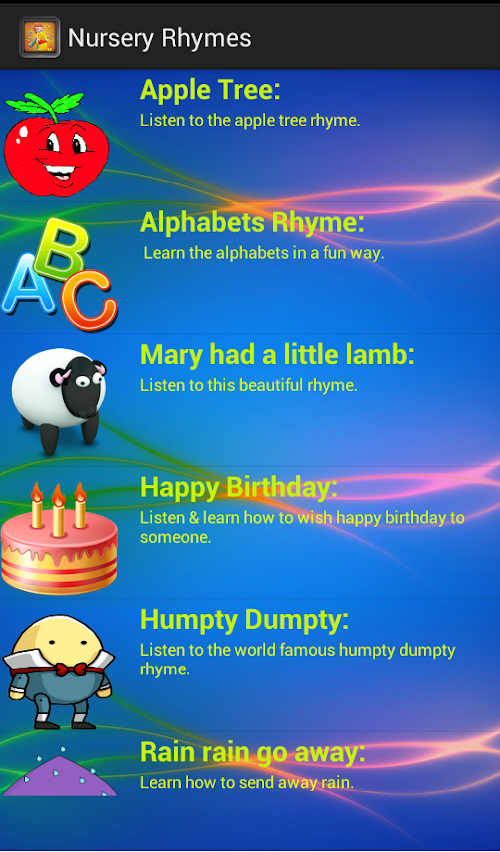 A wonderful Nursery Rhymes app for preschoolers with songs, music, sing-along. A fantastic app for kids featuring 6 very popular Nursery Rhymes: