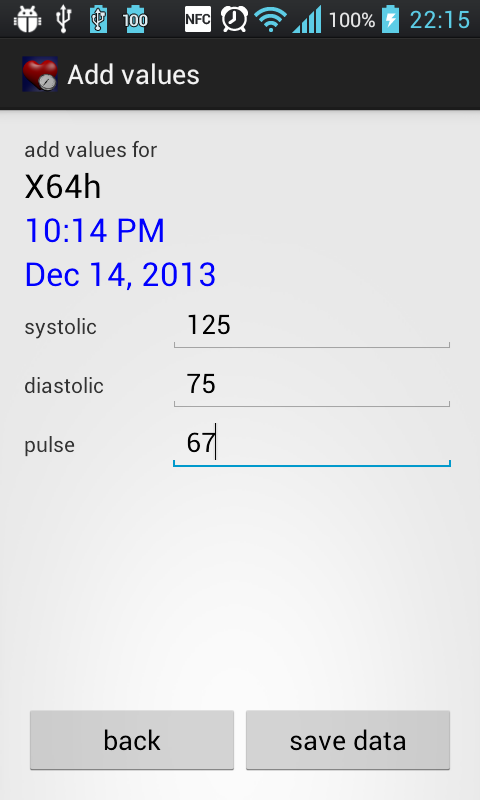When adding values, it selects the current time and date, but you can change those to add previous values. The systolic and diastolic values are mandatory, the value for the heart rate is optional.