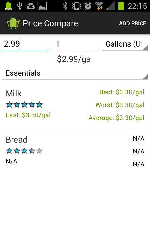 - By entering price, amount and mass/volume you can compare against previously entered prices instantly. Conversions between imperial/metric are performed automatically