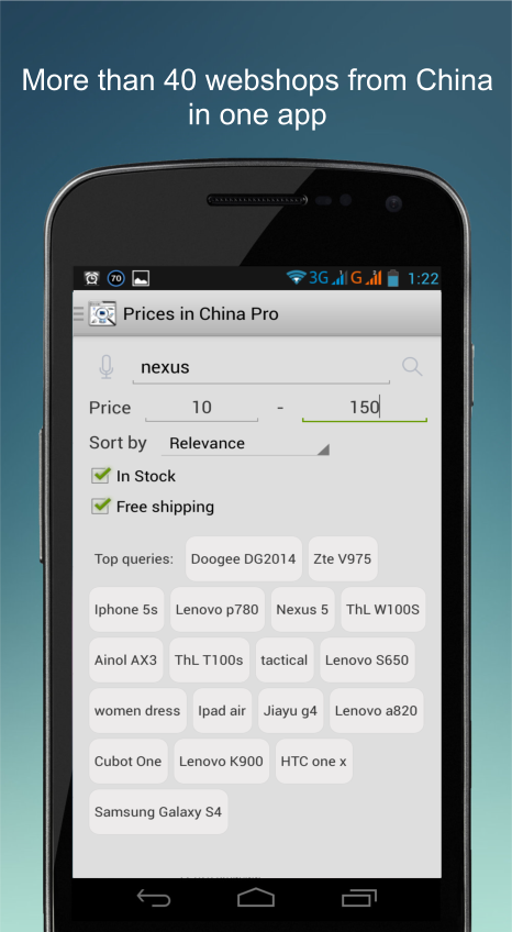 The application is for you if you are interested in: search goods in China, comparison of prices, discounts and sales, Internet shops of China, Chinese wholesale shops, discount coupons, parcels or delivery from China, free shipping etc.