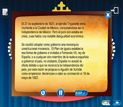 Es una aplicación tipo “Histograma”, donde dejamos de lado el mito que la historia es aburrida con esta aplicación regresar al pasado es lo más divertido. Daremos un recorrido por el museo de historia reviviendo los primeros años de la vida independiente mediante ejemplos dinámicos y entretenidos. Está aplicación es multilenguaje (Español, Inglés) con características de realizar tus propias notas, repetir los audios cuantas veces se requiera y una evaluación para poner en práctica los temas revisados durante la clase.We are a company committed to children's education in Mexico, we know you mean to kids today is why, innovate tools that strengthen and support LEARNING.