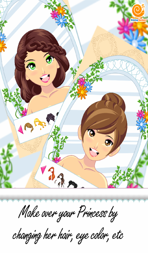 Firstly, go to make up session first. In this section, you can choose Princess Ayya's skin color, such as tan, bright, dark. Later on, choose your favorite eye shadow, eye color, eyebrow, even mascara. You can also change her hairstyle. Last but not least, give a face-lift on her lips to make her look more striking in front of the Prince.