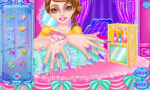 Color and decorate your princesses nails so they give her a new look while matching her outfit! You can choose nail color, bling, nail type, and nail accessories!